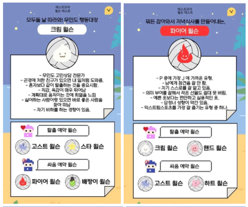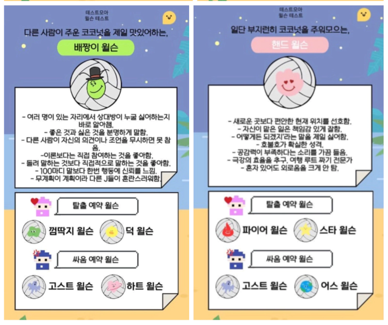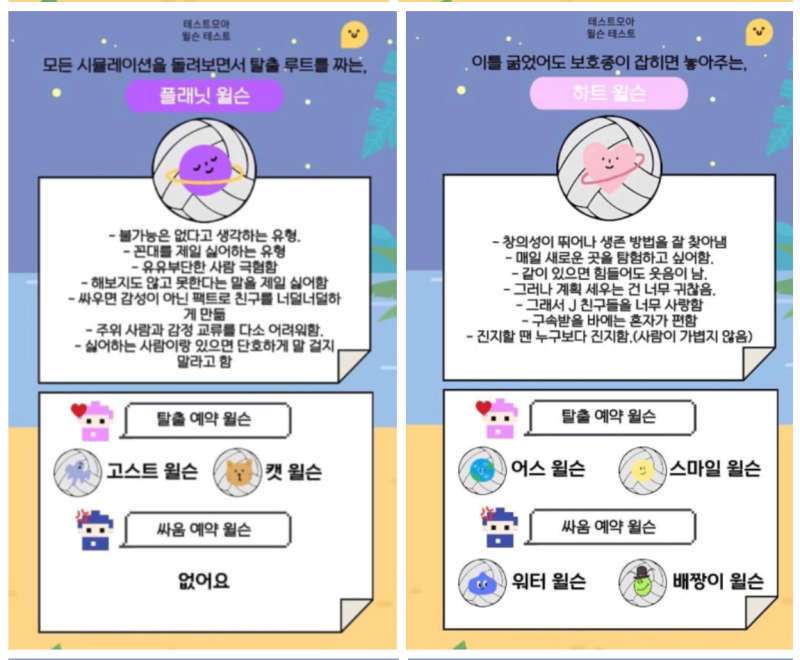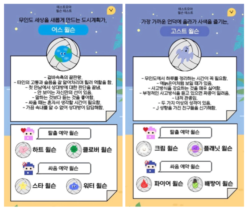 테스트모아 윌슨 테스트를 해보았습니다. 무인도에 같이 갈 나와 찰떡궁합 내 친구 윌슨을 알아보는 테스트인데요. 윌슨 테스트 질문 결과 모든 유형 mbti를 기록해봅니다.